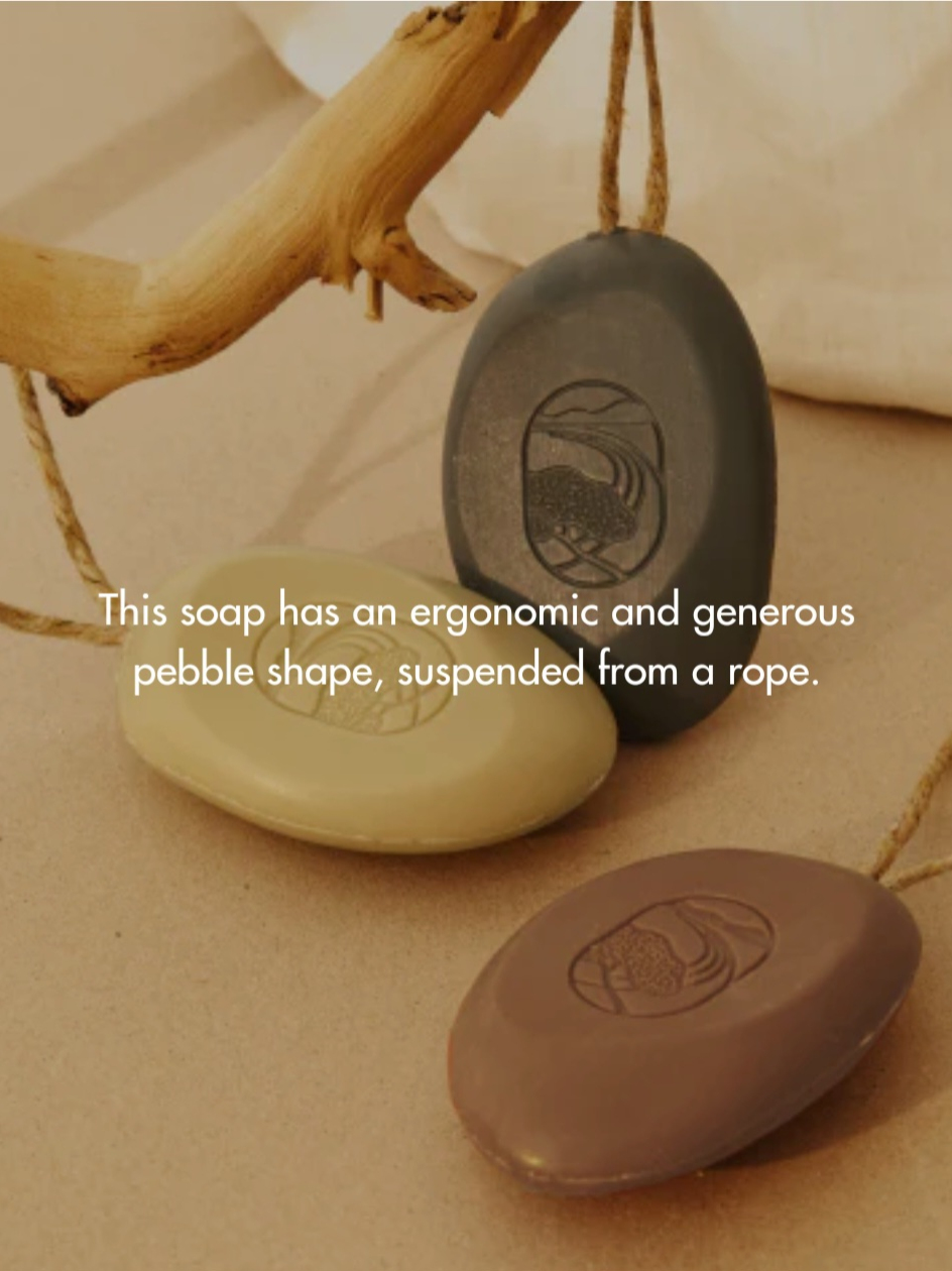 - Design: Ergonomic pebble shape suspended from a cotton rope for easy handling and storage.