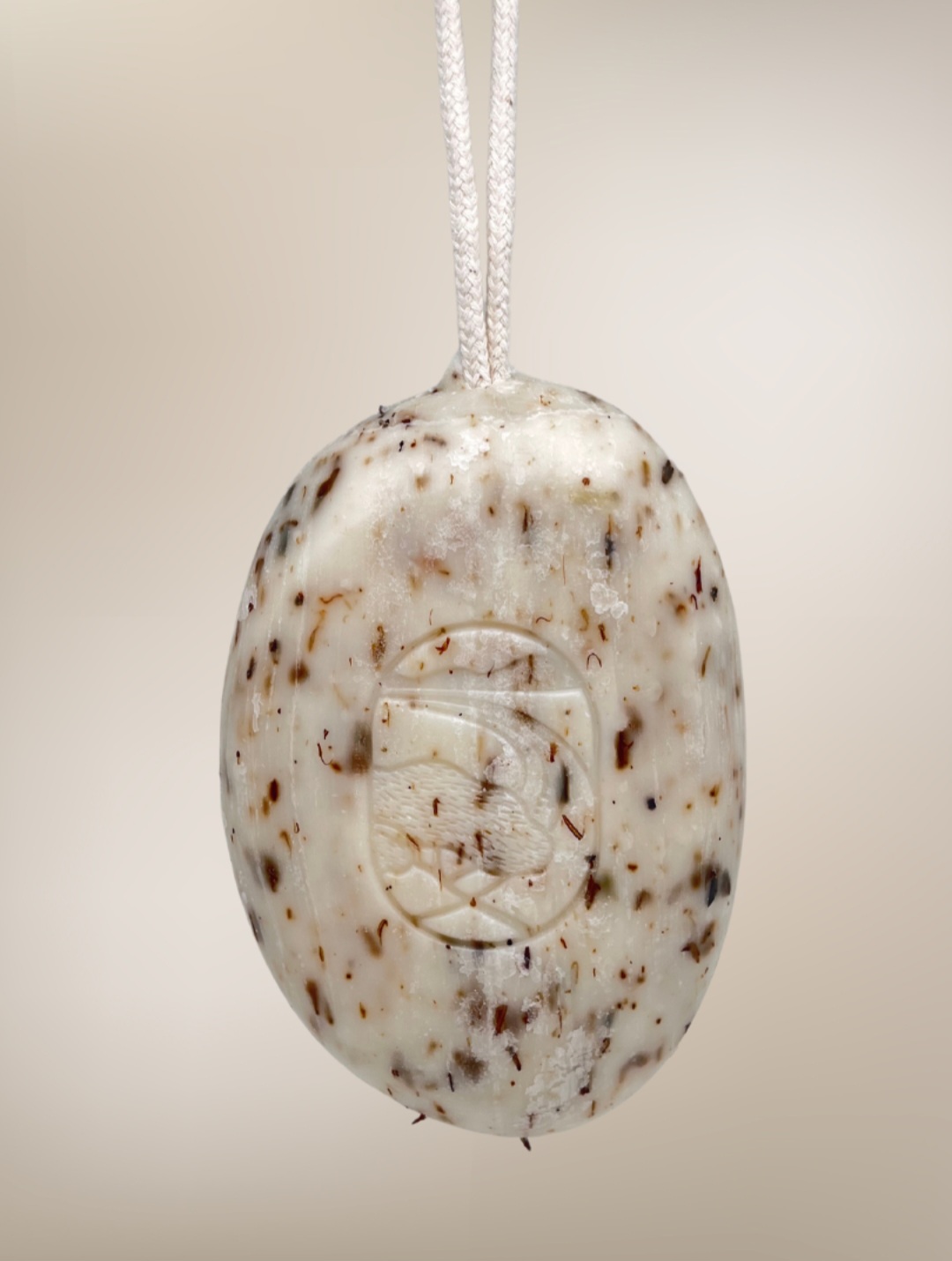 AQUI D’AIA Lavandin Abrial Essential Oil Exfoliating Soap Pebble on a Rope