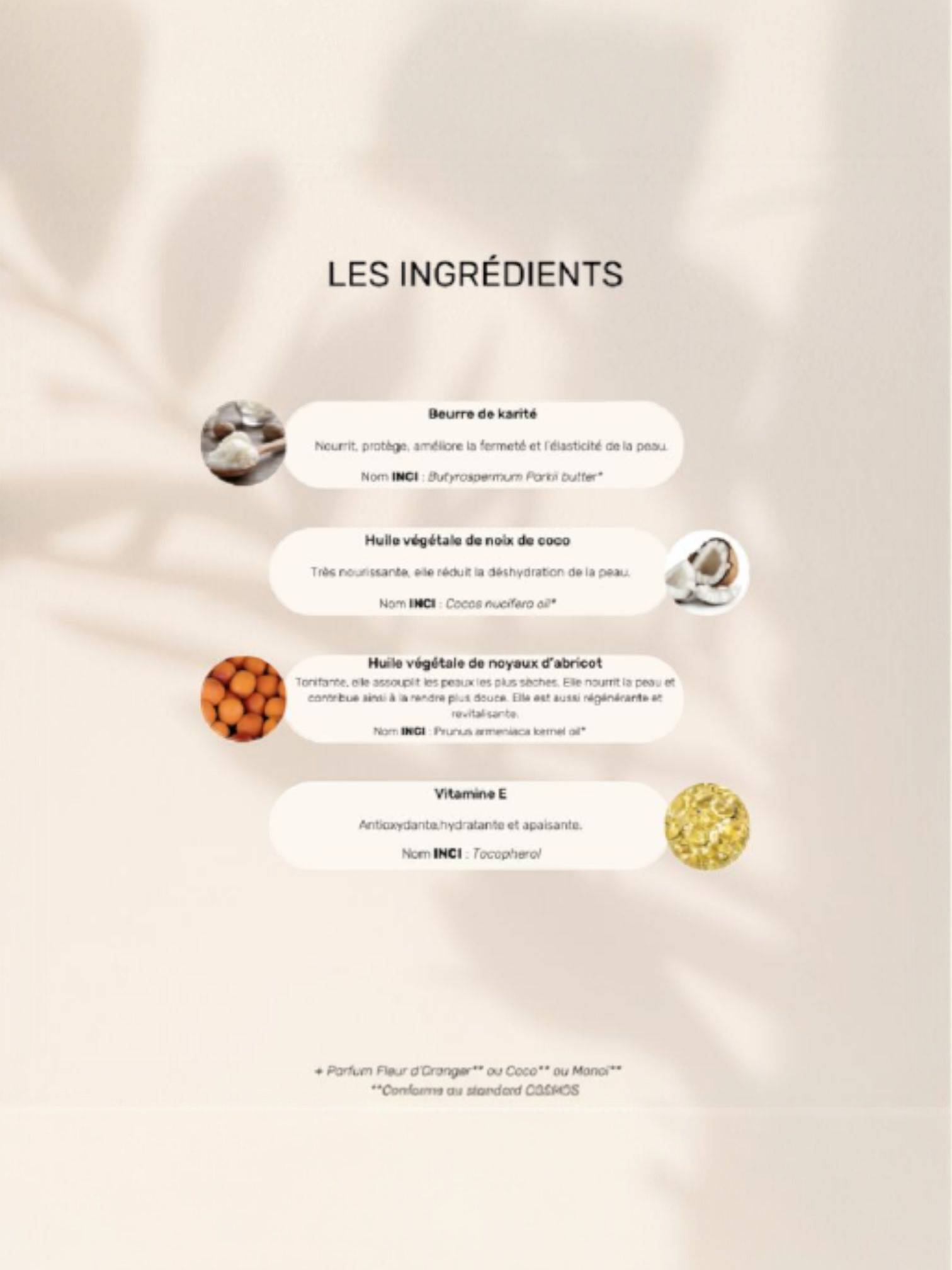 | INCI List | Butyrospermum parkii butter*, Cocos nucifera oil*, Prunus armeniaca kernel oil*, Fragrance**, Helianthus Annuus Seed Oil, Tocopherol, Citronellol, Geraniol, Limonene, Linalool |